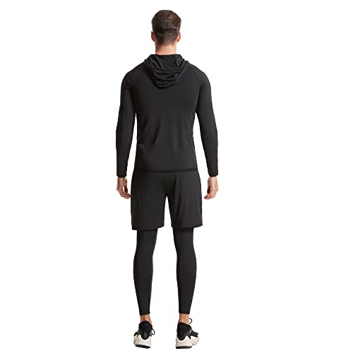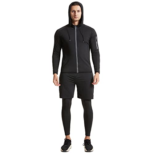 Men Fitness Gym Set–Workout Clothing Ultra-light weight smooth comfort fitting 5 in 1 set. Hoodies jackets + short sleeve&long sleeve compression t shirt + running shorts + compression leggings.