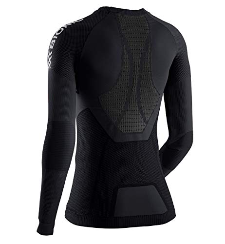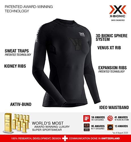 The X-Bionic invent 4.0 running shirt long sleeve Women makes it easy for you to win on any running course. The new 4.0 Generation is the first to feature the retina ultra-high definition quality for maximum accuracy of functionality. The shirt is a powerful high-tech Pioneer for ambitious runners And includes the technological advantages of retina ultra-high-definition manufacturing technology. The 3D Bionic Sphere System plays a decisive role in Continual climate regulation with a shape-optimized surface on the chest and an extended zone on the back. It Cools When You Sweat And Warms When You are Cold. Enlarged sweat Traps balance the temperature through accurately targeted evaporation, And the kidney ribs inserted into the dense Knit Fabric simultaneously insulate the Sensitive Kidney and pelvic area. For even more wellbeing when running Long distances, The innovative cut maximizes wearing comfort: The higher-cut waistband with ideo-waistband and the shoulder-flex-zone in the shoulder area are among the highly Elastic material structures that stay in Shape with every movement and prevent skin irritations caused by annoying chafing.