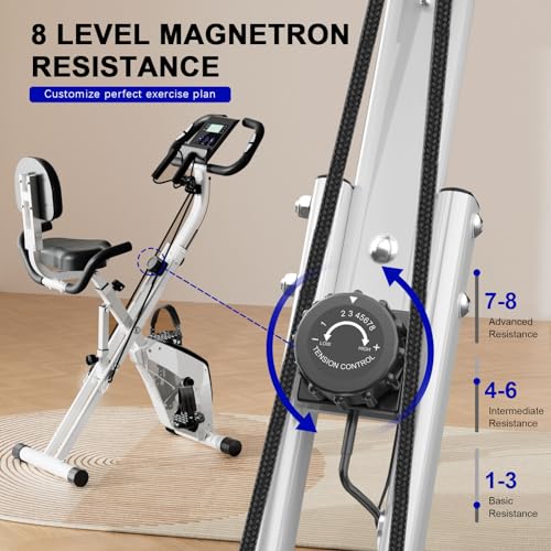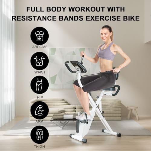 【4 in 1 Whole Body Workout Bike】The upright posture of this 4 in 1 foldable exercise bike provides you with high-intensity exercise and helps you burn more calories. The semi-recumbent posture with a low impact and more comfortable riding experience. This exercise bike foldable also comes with arm resistance bands, which helps to tone your upper muscles and your whole body workout.
