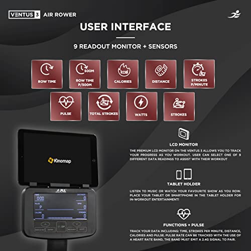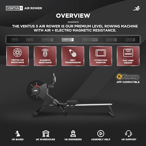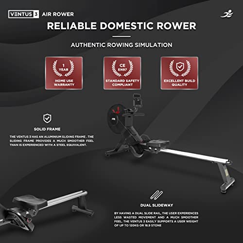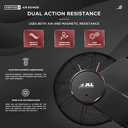 JLL® Ventus 3 Air Resistance Home Rowing Machine, 2024 Model, Kinomap App Compatible, Fitness Cardio Workout with 16 Levels of Electro-Magnetic Resistance, Advanced Driving Belt System