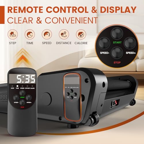【REMOTE CONTROL & LCD DISPLAY】The remote control allows you to conveniently adjust the speed of the walking pad during training. Our treadmills are supplied with a storage box for the remote control, in which you can store it when not in use. The clear LCD display shows you all the important information such as time, speed, distance and calories burned so that you can keep on your training in the best possible way.