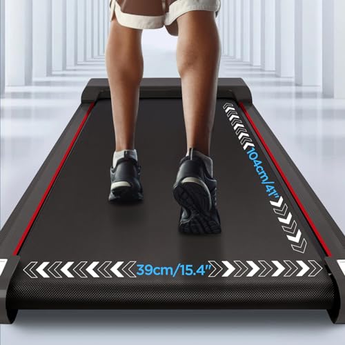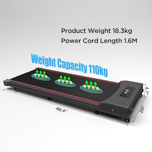 【Easy to Store and Move】With desk treadmill space-saving design, the flat slim treadmill is only 48.6″ x 20″ x 4.9” in size and can be easily set under your office desk, and stored under a bed or sofa. The built-in wheels make the portable treadmill easy to move around.