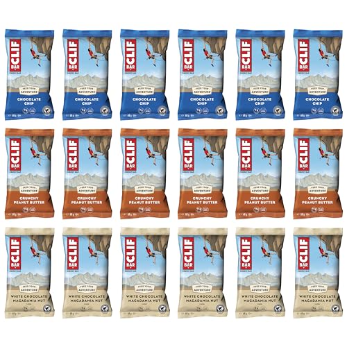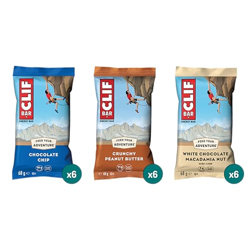 Multipack containing 18 Clif bars: 6 x Chocolate Chip, 6 x Crunchy Peanut Butter, 6 x White Chocolate Macedamia