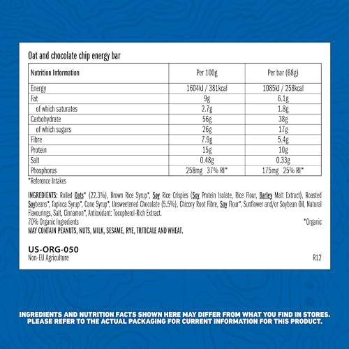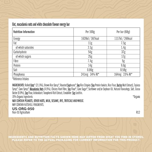 CHOCOLATE CHIP Rolled Oats* (22.3%), Brown Rice Syrup*, Soy Rice Crispies (Soy Protein Isolate, Rice Flour, Barley Malt Extract), Roasted Soybeans*, Tapioca Syrup*, Cane Syrup*, Unsweetened Chocolate‡ (5.5%), Chicory Root Fibre, Soy Flour*, High Oleic Sunflower Oil*, Natural Flavourings, Sea Salt, Cinnamon*. CRUNCHY PEANUT BUTTER Rolled Oats* (21.1%), Brown Rice Syrup*, Tapioca Syrup*, Soy Rice Crispies (Soy Protein Isolate, Rice Flour, Barley Malt Extract), Cane Syrup*, Roasted Soybeans*, Peanut Butter* (6.2%), Peanuts (5.9%), Peanut Flour (4.5%), Chicory Root Fibre, Soy Flour*, Natural Flavourings, Sea Salt. WHITE CHOCOLATE MACEMIA NUT Rolled Oats* (21.9%), Brown Rice Syrup*, Roasted Soybeans*, Soy Rice Crispies (Soy Protein Isolate, Rice Flour, Barley Malt Extract), Tapioca Syrup*, Cane Syrup*, Macadamia Nuts (4.9%), Chicory Root Fibre, Soy Flour*, Cane Sugar*, Sunflower and/or Soybean Oil, Natural Flavourings, Salt, Cocoa Butter (0.9%), Soy Flour, Antioxidant: Tocopherol-Rich Extract, Emulsifier: Soy Lecithin. 70% Organic Ingredients *Organic