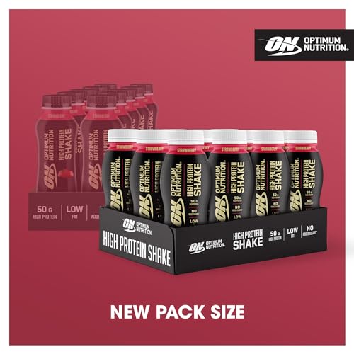 ON High Protein Shake Bottles, Ready to Drink Healthy Snacks, No Added sugars, Low Fat, Post Workout Snack for Men and Women, Strawberry Flavour, 12x500ml, Packaging May Vary