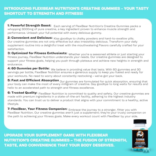 Your Body Deserves It: Looking for a way of maximizing your muscle growth in a safe, natural way? Would you like to make sure your body receives its well-deserved dose of daily nutrients for optimal functioning? The FlexiBear creatine supplement is the perfect choice!