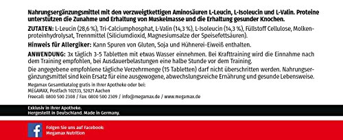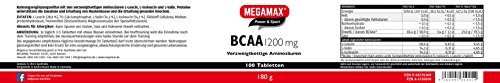Pack size: 100 tablets à 1,200mg BCAA per tablet. MEGAMAX BCAA 1,200mg is a food supplement in tablet form which specifically allows you to absorb the branched chain amino acids leucine, isoleucine and valine. What are branched chain amino acids? BCAAs are vital substances which your body cannot itself produce. They must be absorbed in sufficient amounts form food. In a balanced diet you will find BCAAs in meat, fish and pulse vegetables. With MEGAMAX BCAA 1200g you can specifically take in the amino acids also between meals. The amino acids are used to form proteins, which contribute to the maintenance and increase in muscle mass, and also to maintaining bones. Contents: 100 tablets Tablet intake: on days when you will be placing intense demand on your muscles, you can take 5 MEGAMAX BCAA 1,200g with some liquid three times during the day. If your training demands are not so high, taking 3 tablets three times a day is enough. If you do not wish to swallow the tablets with water, you can also break them up in a mortar and stir the resulting powder into yoghurt, for example. For weight training you should plan to take the tablets after the session; in the case of endurance training it is best to take the tablets half an hour before training. MEGAMAX BCAA 1,200mg contains l-leucine (28.6%), bonding agent calcium phosphate, l-valine (14.3%), l-isoleucine (14.3%), bulking agent cellulose, whey protein hydrolysate, releasing agent silicon dioxide and magnesium salts from cooking fatty acids. You will find further information about nutritional value, allergies advice, recommended intake and food labelling on the label (see the image under the product photo).