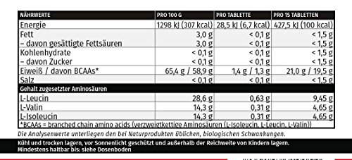 L-Leucin (28,6 %), Tri-Calciumphosphat, L-Valin (14,3 %), L-Isoleucin (14,3 %), Füllstoff Cellulose, Molkenproteinhydrolysat, Trennmittel (Siliciumdioxid, Magnesiumsalze der Speisefettsäuren).