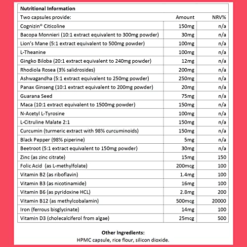 MULTI-BENEFICIAL FORMULA – Contains a powerful blend of high-strength vitamins and minerals, superfoods such as Maca, and natural nootropics and adaptogens like Lion’s mane, Curcumin, Ginkgo Biloba, Ashwagandha, Bacopa Monnieri, Panax Ginseng, and Beetroot. Also contains the much revered, scientifically proven Cognizin(R) Citicoline.