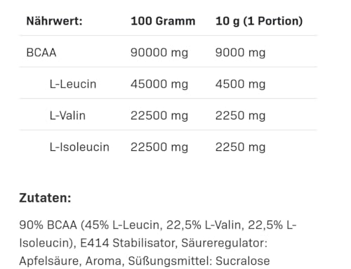 90% bcaa (45% l-leucine, 22.5% l-valine, 22.5% l-isoleucine), stabiliser e414, acidity regulator: malic acid, flavour, sweetener: sucralose