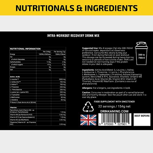 5-STAR RATED FOR TASTE, SUGAR FREE & LOW CALORIES: With 5g of EAA powder per serving (including the BCAA amino acids), our amino energy recovery powder includes Vitamin B complex (B5, B6, B12, B1, B2) to counteract increased B vitamin turnover. Our intra-workout amino acid nutritional supplements are great value for money for guilt free consumption.