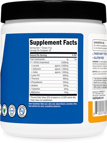 Nutricost EAA powder contains 30 Servings of essential amino acids in every bottle. This blend contains 11 grams per serving and includes 2:1:1 BCAA. Each serving also includes other amino acids, such as L-Lysine HCl, L-Threonine, L-Phenylalanine, L-Histidine, L-Tryptophan, and L-Methionine.