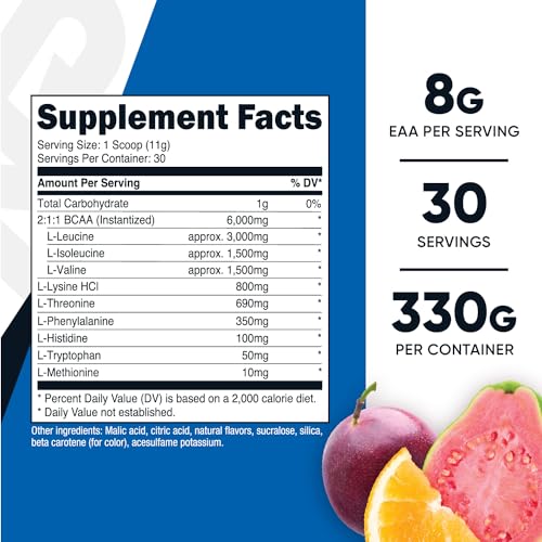 2:1:1 BCAA (Instantized) [L-Leucine, L-Isoleucine, L-Valine], L-Lysine HCl, L-Threonine, L-Phenylalanine, L-Histidine, L-Tryptophan, L-Methionine, malic acid, citric acid, natural flavors, sucralose, silicon dioxide, beta-carotene (for color), acesulfame potassium