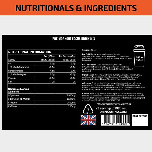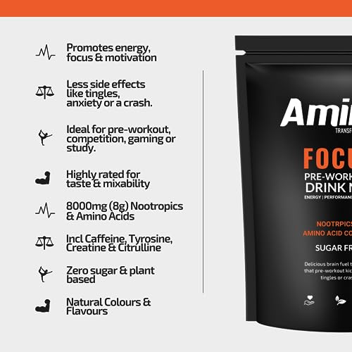 8000MG OF NOOTROPICS FOR MENTAL FOCUS: This amino acid drink for pre work out includes Caffeine, Tyrosine, Creatine & Citrulline, scientifically designed to reduce fatigue, promote wakefulness & increase power. Amino focus gives you the edge over your competition.