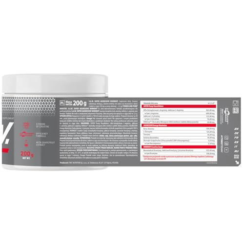 SUPER SUPER Pump Vasodilators [L-Arginine Alpha-Ketoglutarate; Citrulline Malate; L-Arginine Malate; ViNitrox™: Grape (Vitis vinifera) and Apple Extract (Malus pumila)] (41.6%); AGGRESSIVE Energy Maximizer [beta-alanine; L-tyrosine; taurine; anhydrous caffeine; grapefruit extract (Citrus paradisi) [98% naringenin]] (27.0%); WORKOUT Creatine Surge [creatine monohydrate; tri-creatin malate; creatine ethyl ester] (25.0%); flavourings; acidity regulators (malic acid, citric acid); anti-caking agent (silicon dioxide); sweetener (sucralose).
