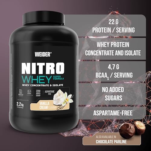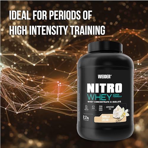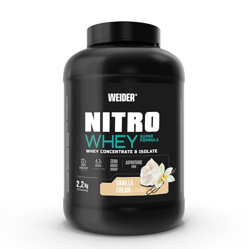 Weider Nitro Whey Super Formula (2,2kg) Vanilla Cream Flavour. 22g Protein/Serving from Quality Whey Concentrate & Isolate + 4,7g BCAA/Serving, L-Glutamine, Vitamin B6, No Added Sugar, No Aspartame