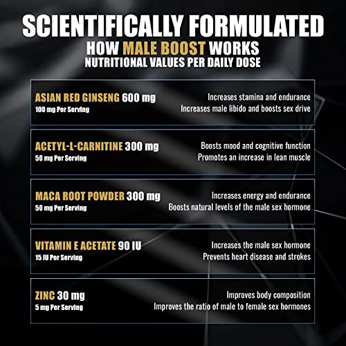 Male Boost has been exclusively designed to help improve male confidence, increase vitality, boost strength and muscle mass. This is a very powerful testosterone booster giving superior results fast. Male Boost is a specially designed male confidence, strength, muscle and testosterone booster formulated with a natural, but potent, mix of ingredients, including Asian Red Ginseng, Maca Root Powder, Vitamin E and Zinc. Why use Male Boost? Male Boost is the ideal supplement for everyone, from supplement beginners to athletes and body builders, looking to increase their strength, confidence and muscle development.