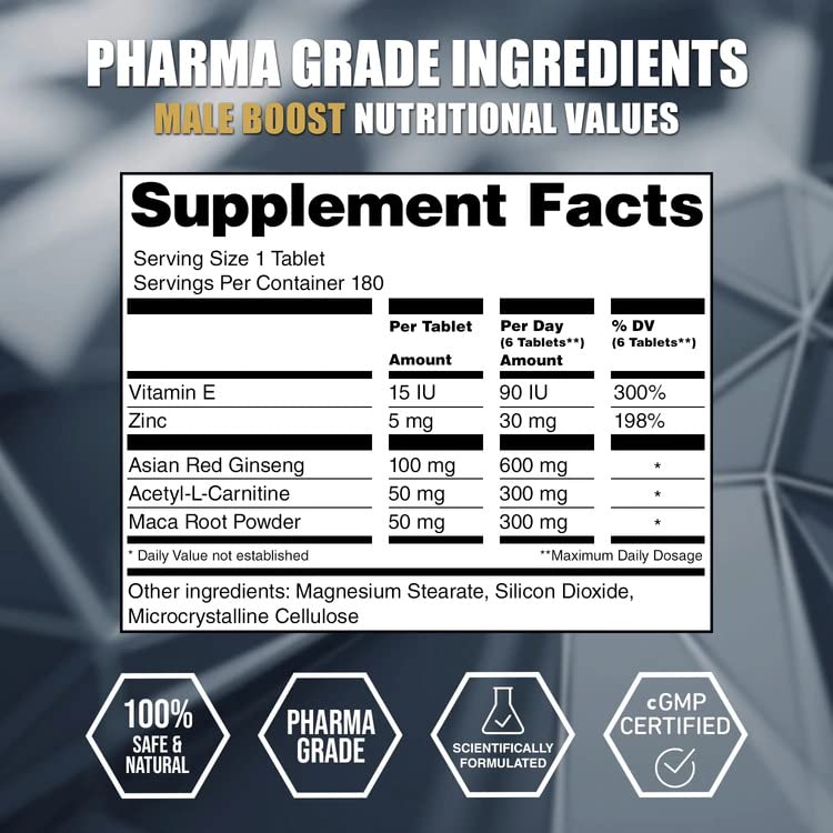 Each tablet contains : Asian Red Ginseng 100 mg, Acetyl-L-Carnitine 50 mg, Maca Root Powder 50 mg, Vitamin E Acetate 10 mg, Zinc 5 mg