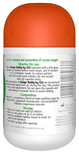 XLS Medical Hunger Buddy Promote weight loss by reducing hunger pans, controlling portion sizes and preventing snaking. Made with Redusure™, a blend of dietary fibres that expand 200x its original size, forming a gel that fills 30-43 % of the stomach and creating a pleasant sensation of fullness. An important step to manage and control your weight – XLS Medical Hunger Buddy is a compliment aid of an overall weight management plan. You can continue its intake even after reaching your goal weight on occasions of experiencing an increment on appetite or hunger pangs. Ingredients Redusure™, a proprietary blend of high-swelling capacity dietary fibres, potassium bicarbonate, microcrystalline cellulose, magnesium stearate. Directions To control portion sizes or manage appetite, take two capsules of Hunger Buddy by XLS with a full glass of water (approximately 250 ml) 30 mins before your main meals. To prevent snacking, take one or two capsules with a full glass of water between meals. Do not exceed nine capsules per day. Drink plenty of water. Safety Warning Hunger Buddy by XLS is a medical device. Only recommended for adults over 18 years of age. The use of this product by adolescents 12-18 years old is subject to the supervision of healthcare professionals. This product must be taken as a whole capsule with a full glass of water (approximately 250 ml). Do not open the capsule and avoid taking in powder form to avoid choking. Please read the enclosed product insert before use. It is recommended to drink at least 2 litres of water a day. Slight constipation could occur in case of limited liquid intake. Do not take during pregnancy or whilst breastfeeding, or if your BMI is below 18.5. Consult your healthcare professional before taking this product if you have any medical condition or if you are diabetic. Keep out of reach and sight of children. Please read the enclosed product insert before use. Box Contains 40 Capsules