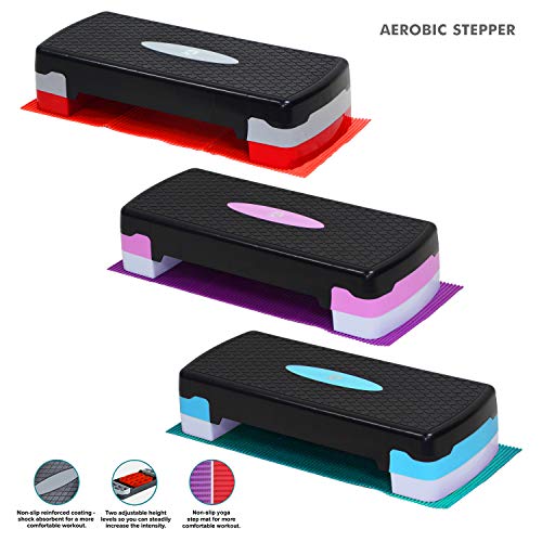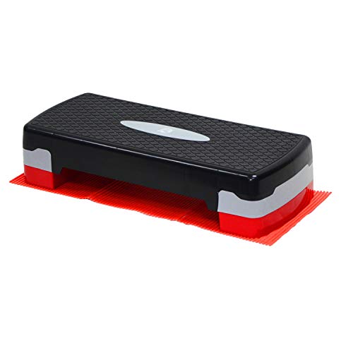 Ramp up your fitness regime with the exercise aerobic 2 level adjustable yoga step with non slip yoga step mat. Whether you’re looking to tone up, shed a few lbs or just improve your general fitness, the stepper lets you enjoy an effective low impact, high intensity aerobic workout. Beneficial in a number of ways, the stepper is great for fat burning, core stability, leg, bottom and stomach toning, improved cardiovascular health and muscular endurance, plus enhanced stamina, co-ordination and balance. Also ideal for rehabilitation exercises. Generously sized step area measures 68.5 x 29cm and features a non-slip reinforced coating – shock absorbent for a more comfortable workout. Non-slip rubber stoppers on the base of the stepper provide a firm and safe grip on flooring whilst also helping to minimize noise during workouts.