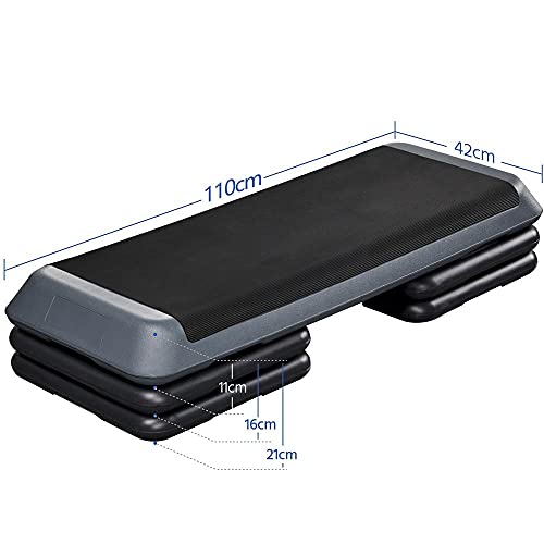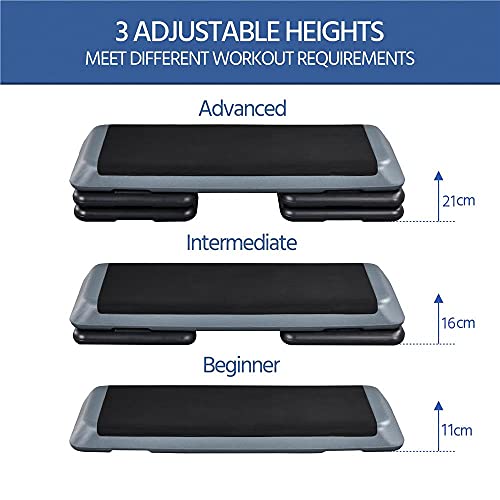 3 Levels for Various Needs: This fitness step features 4 risers (2 on each side) which you can use to easily adjust the stepper height from 11cm/4” to 16cm/6” to 21cm/8”, fulfilling your different training goals.