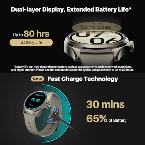 【New Fast Charging Technology and 80Hours 628mAh Battery Life】Dual layers display 2.0 technology delivers Ticwatch Pro 5 smartwatch an astonishing 80-hour battery life. With scheduled or smart Essential Mode, TicWatch Pro 5 dynamically adapts to your lifestyle, effortlessly extending your adventures without any interruption. With the new fast charge technology in the TicWatch Pro 5 you can easily go from 0-65% in just 30 minutes. A quick 15 minute charge will get your watch throughout the day.