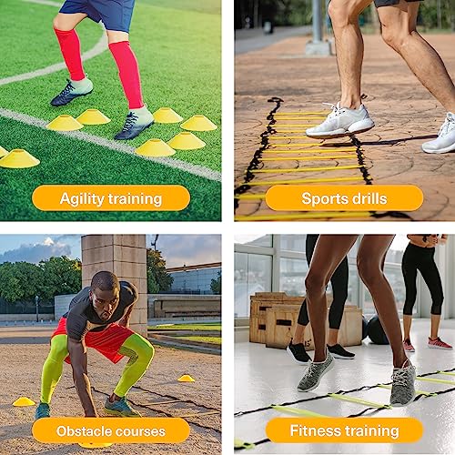 ⚽️ 10 CONES INCLUDED – Our training ladder set comes with 10 durable plastic football cones which can be used to mark out training areas, warm up drills & shuttle based exercises. Also included are 12 plastic rungs that are of great quality & long lasting for training & exercise.