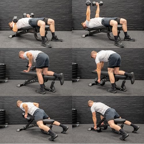 Perfect for dumbbell exercises, bench presses etc – Built in handle and castors for easy movement – Extra thick comfortable black padded cushions