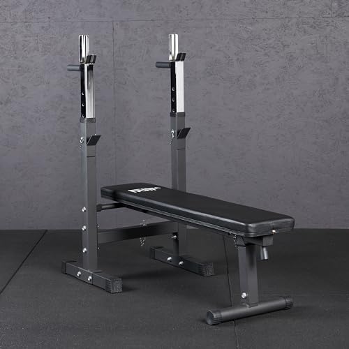 Strong steel construction with comfortable black padded cushions – Height adjustable barbell rack – 5 Adjustments – Durable, black powder coated frame