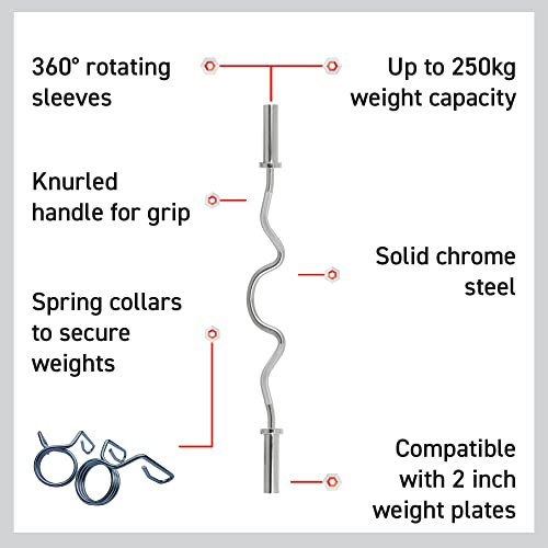 OLYMPIC BARBELL BAR – Made of durable, heavy-duty solid chrome steel with a weight capacity of 120KG. This 4ft Super Curl barbell bar includes Spring Collars