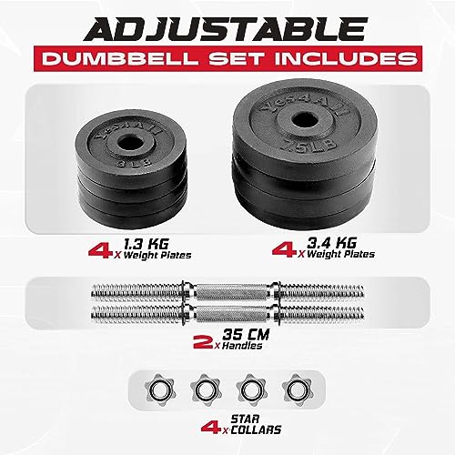 SET OF 2 DUMBBELLS – 22.7 KG TOTAL: TWO 35.5 CM x 2.5 CM handles, FOUR 1.3 kg plates, FOUR 3.4 kg plates, FOUR collars
