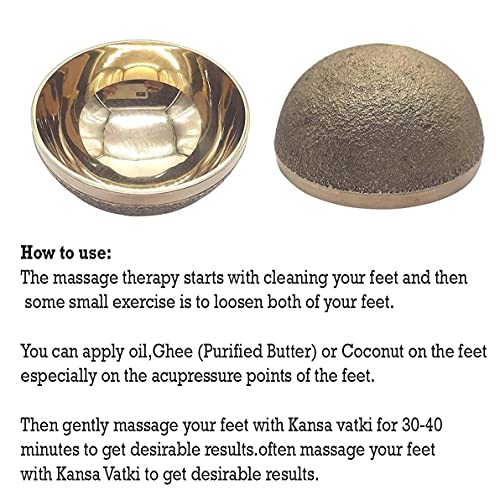 How to use: The massage therapy starts with cleaning your feet and then some small exercise is to loosen both of your feet. You can apply oil,Ghee (Purified Butter) or Coconut on the feet,especially on the acupressure points of the feet. Then gently massage your feet with Kansa vatki for 30-40 minutes to get desirable results.often massage your feet with Kansa Vatki to get desirable results.