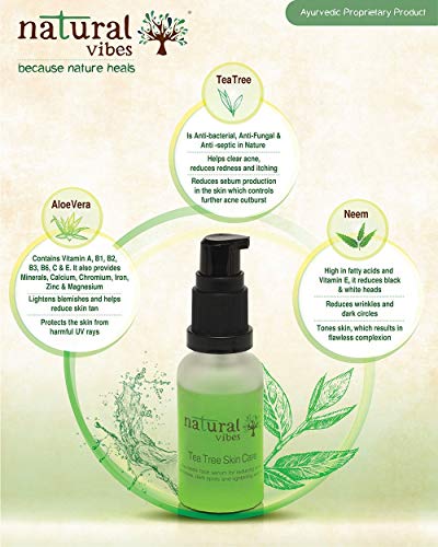 Natural Vibes Tea Tree Skin Repair Serum is a multi purpose ayurvedic proprietary serum formulated from 3 miracle ingredients – Tea Tree, Aloe Vera and Neem(Indian Lilac) to fight multiple skin problems. Throughout the day, toxins from the world around us clog our pores. When your pores arenÃt clear, neither is your complexion and health of your skin. Our serum helps you to fight acne / pimples, blemishes, dark spots and reduces scars. Not only that, Natural Vibes serum pulls the dirt out of your pores leaving you with a lighter, glowing skin. Guess what ? It is absolutely non-sticky and 100% Natural, We promise you won’t feel a thing.